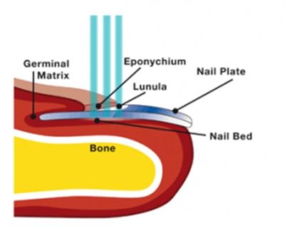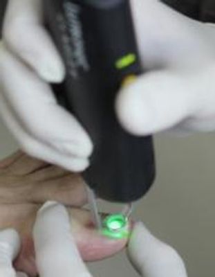 Laser devices emit pulses of energy that produce heat. When used to treat onychomycosis, the laser is directed so the heat will penetrate through the toenail to the nail bed where the fungus is present. In response to the heat, the infected tissue is gasified and decomposed, destroying the fungus and the surrounding skin and nail. The heat from the lasers also has a sterilizing effect, which helps prevent new fungal growth.